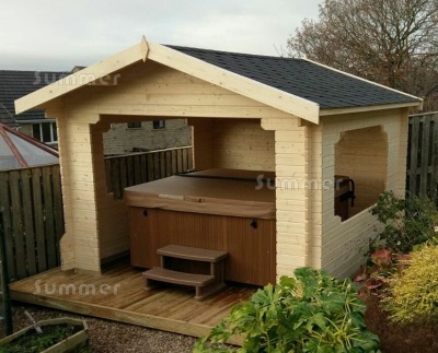 A HOT TUB COVER OR A HEAVY DUTY GAZEBO: This log cabin can be used to cover or enclose a hot tub or spa. Smaller hot tubs will pass through the door opening. Larger hot tubs are positioned before the cabin is installed. There is enough space inside to comfortably accommodate even a large hot tub. This versatile cabin is also popular as a garden gazebo which can be used as a shady retreat in the summer or as a store for garden furniture and toys in winter.