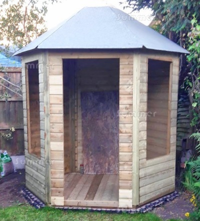 HEXAGONAL BUILDING SIZES: For ease of reference these hexagonal summerhouses are measured as a rectangle. The first dimension listed is the overall width from side to side and the second dimension is the depth from front to back. The overall width is measured at the widest point from corner to corner. The depth is measured at the narrowest point from wall centre to wall centre. Sizes are sometimes rounded to the nearest nominal size for ease of reading but the correct external wall sizes are listed alongside the price. These sizes do not include the roof overhang. Many other suppliers quote the overall roof size which is much larger. All sizes are approximate.