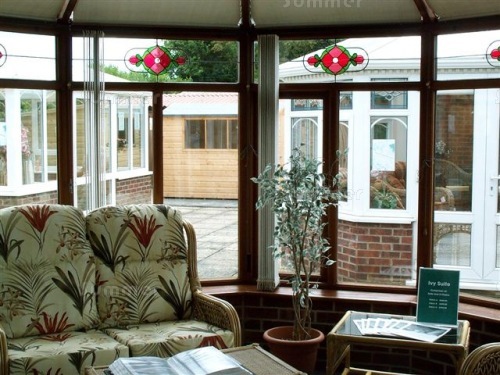 The 4 images below are internal views which show how the display conservatories were fully finished with roof blinds, vertical blinds, tiled floors, cane furniture and ceiling fans - all of which were available as optional accessories. Many conservatory customers were attracted by this all inclusive one stop shopping experience.