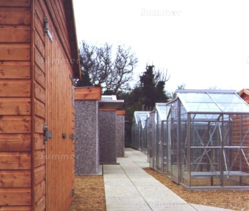Each building was neatly presented with detailed posters listing the features and prices. The 3 images below show sheds, greenhouses, summerhouses and garages on display.