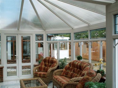 The image below shows the well equipped and comfortable sales office behind the display conservatories, complete with floor tile samples: