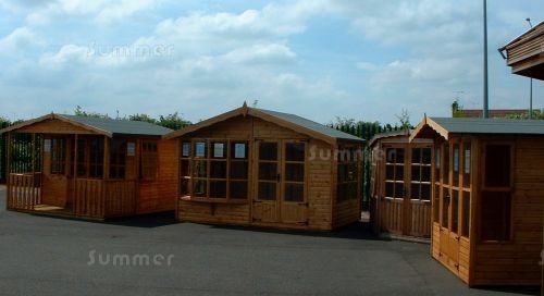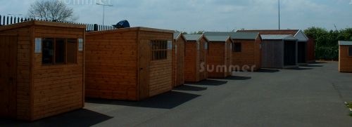 Each building was neatly presented with detailed posters listing the features and prices. The images below show sheds, greenhouses, summerhouses, playhouses and garages on display.