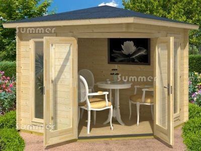 A popular size for a smaller log cabin is 8'x8' (2.4x2.4m) with enough space for a 6 seater corner lounge set or a 4-6 seater dining set. Another popular size is 10'x10' (3x3m) which is already larger than most garden summerhouses. Larger log cabins range from 10'x13' (3x4m) up to 14'x20' (4x6m). Multi room log cabins may be even larger. Arranging furniture in your house or in a small room can often be a useful guide to the size you need. Most people buy the biggest size that fits comfortably within the available space in the garden.