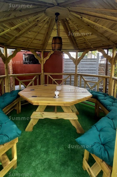 The picture shows the standard gazebo with optional benches and table. The bench cushions are no longer available.