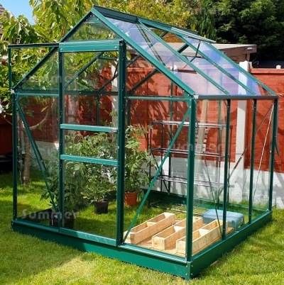 This unbeatable value greenhouse is approximately 6'x4', 6'x6', 6'x8' or 6'x10' with incredible prices for green finish with toughened glass. The strong and durable frames are green powder coated aluminium. Luxury features include a sliding door with handle and 2 free opening roof vents. The frame includes triple eaves corner plates for added strength. Extra braces and struts are also included for extra strength and rigidity. The door is in the 6'5" wide wall. A base plinth is also included, which makes installation easier. Detailed fitting instructions are supplied for DIY self assembly. Low cost installation is available in many areas.