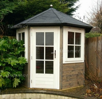 - External summerhouse size measured as a rectangle 8'0"x8'0" (2.45m x 2.45m) or 9'10"x9'10" (3.0m x 3.0m)